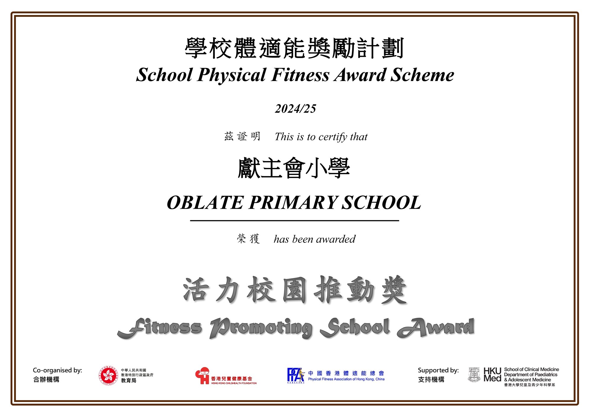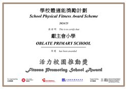 我校貫徹著重學生的健康體適能的意識及鼓勵他們經常參與體育活動,每年會參與由教育局、中國香港體適能總會及香港兒童健康基金合辦的「學校體適能獎勵計劃」,學生若測試成績達到指定水平便可獲得章級證書。我校亦榮獲本年度「活力校園推動獎」,在此感謝教師、家長、同學們的積極投入參與與協助。