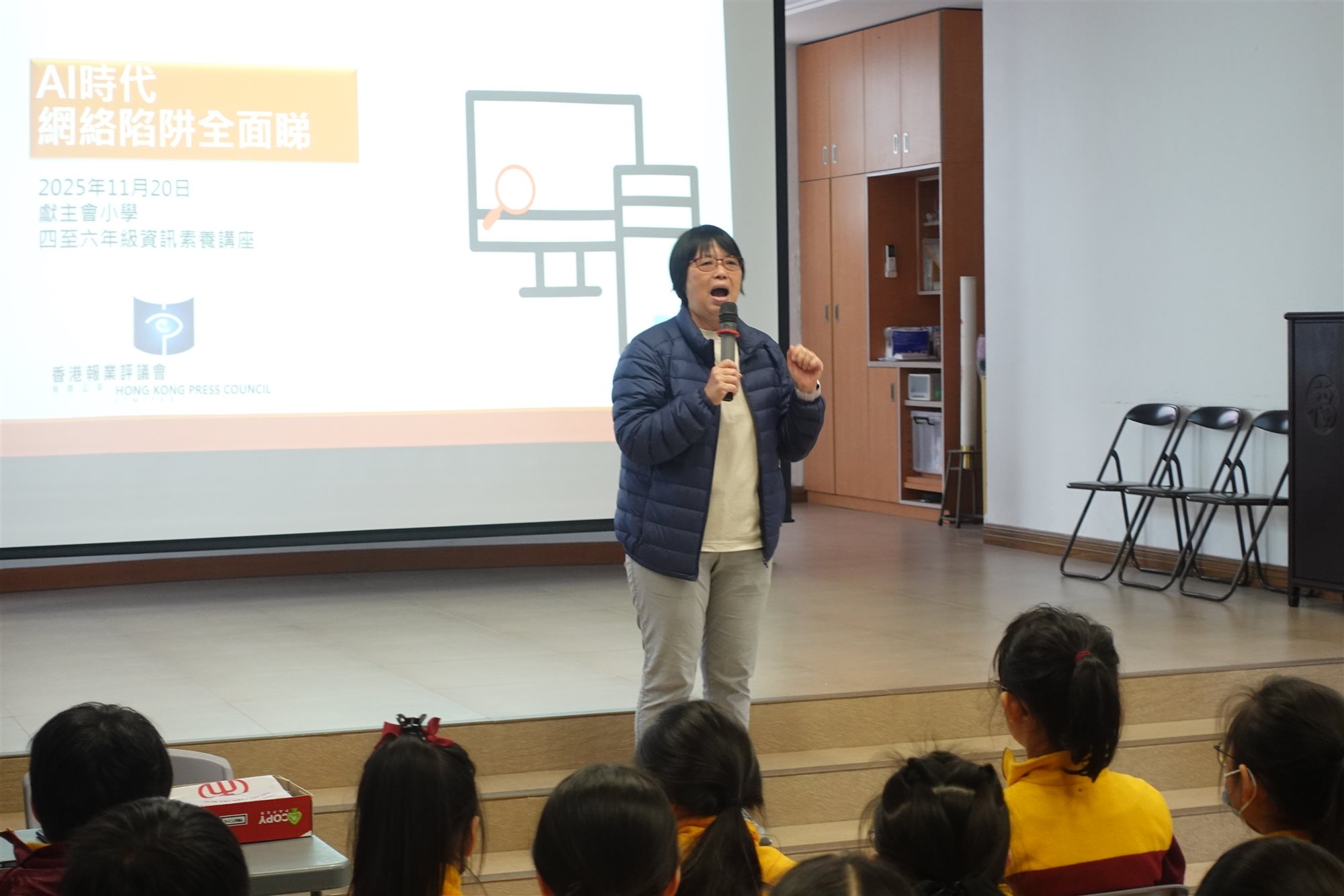 日期:20-11-2025 P.4-P.6 本校邀請香港報業評議會傳媒資訊素養教育項目統籌主任陳小冰女士到校為四至六年級學生主持主題為「AI時代網絡陷阱全面睇」, 透過陳小冰女士的講解及經驗分享,讓學生能認識AI對資訊真偽帶來的挑戰,懂得保護個人資料免受騙,並了解其他網絡陷阱。