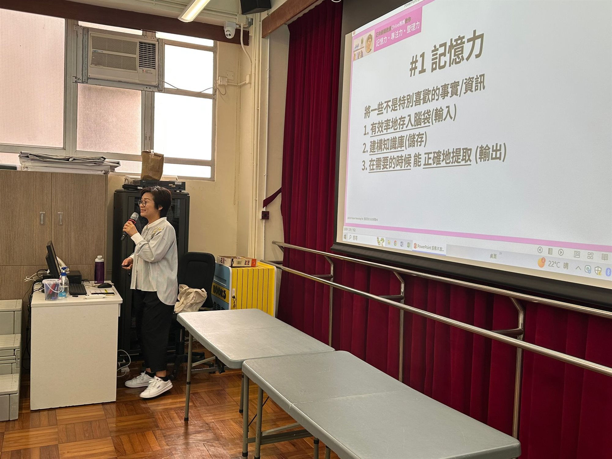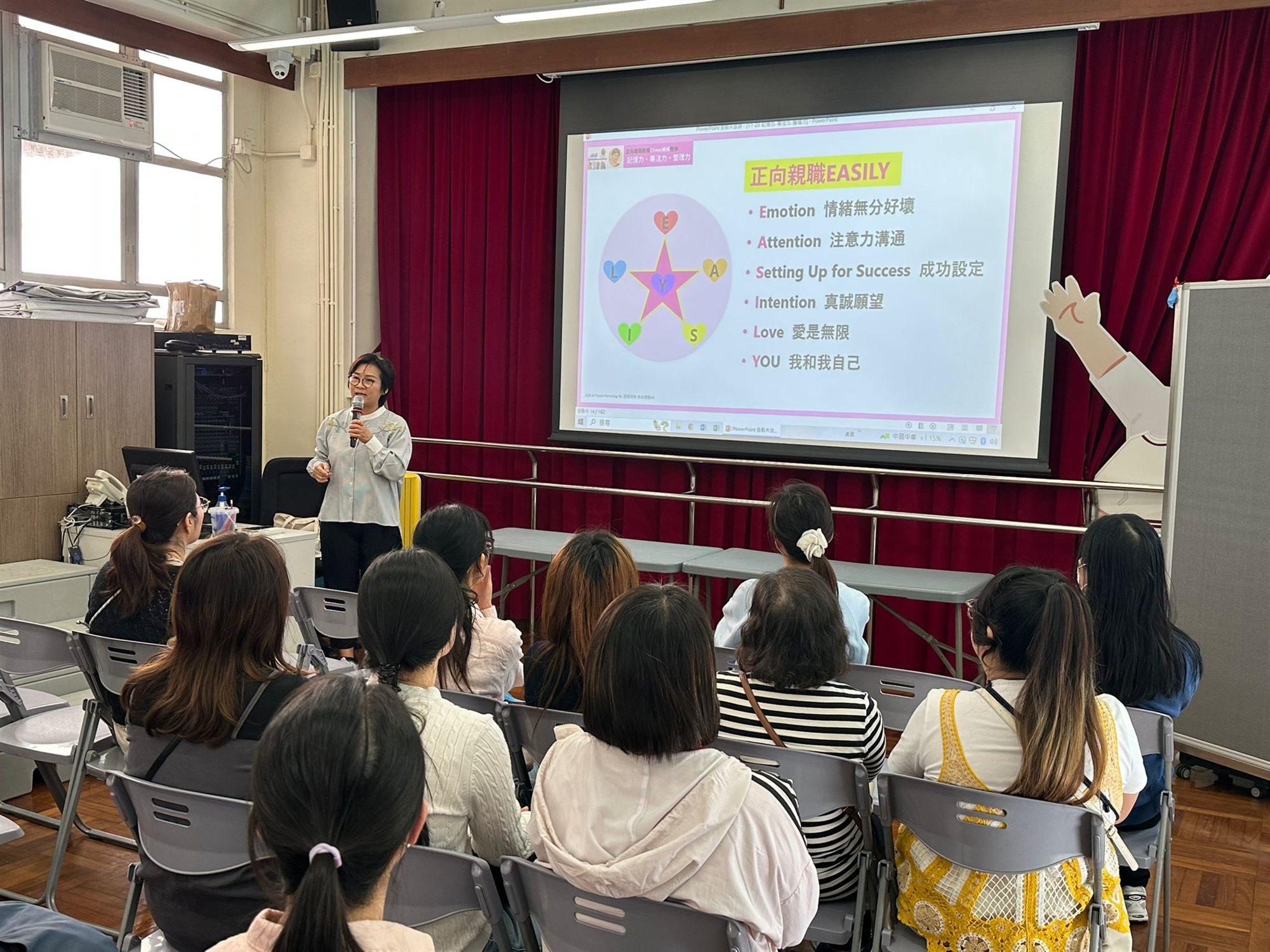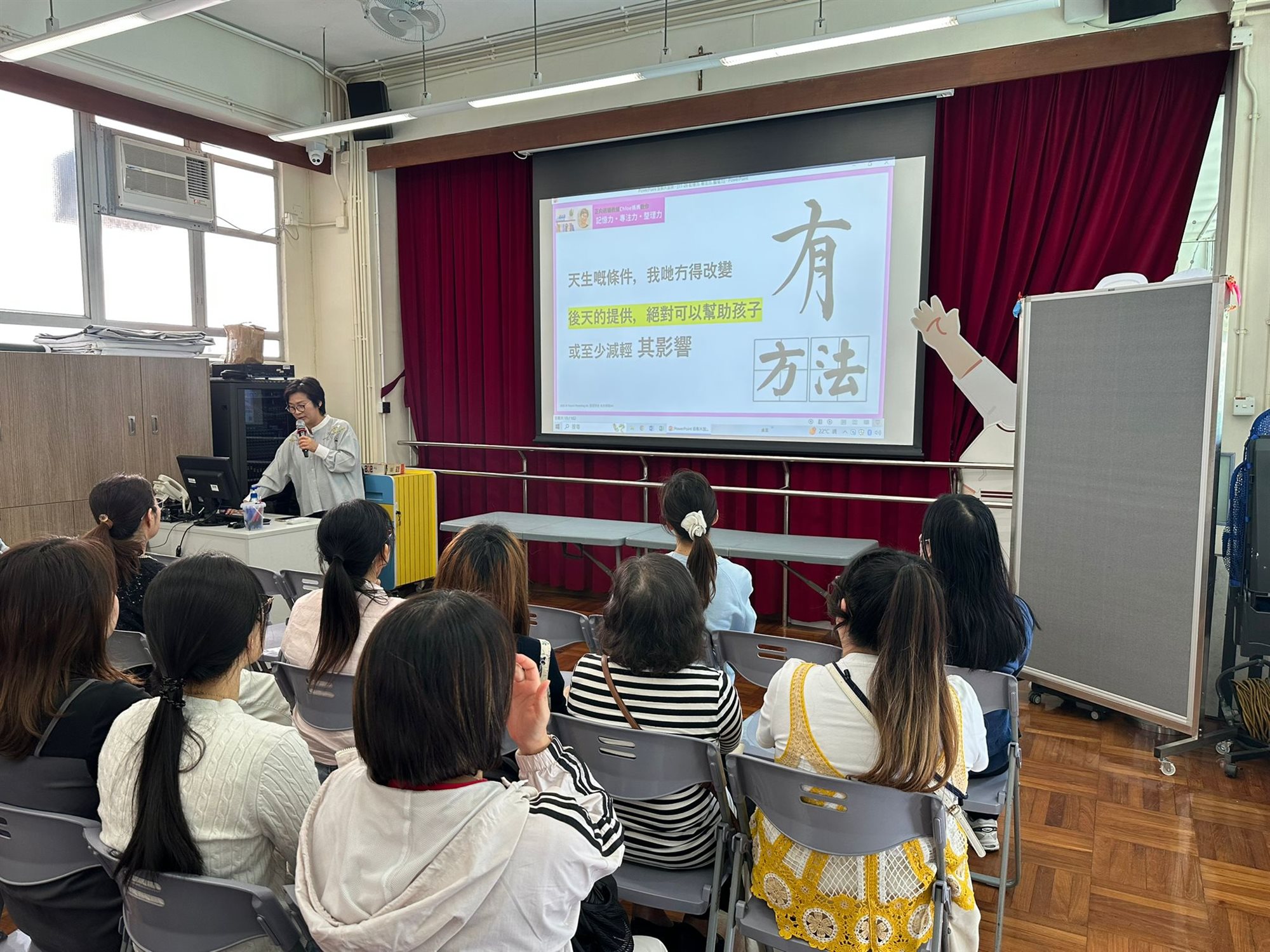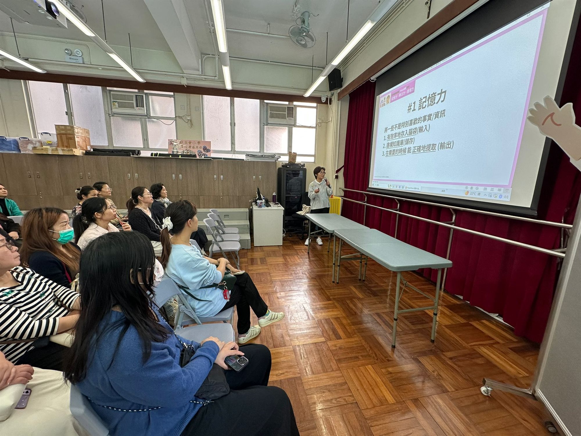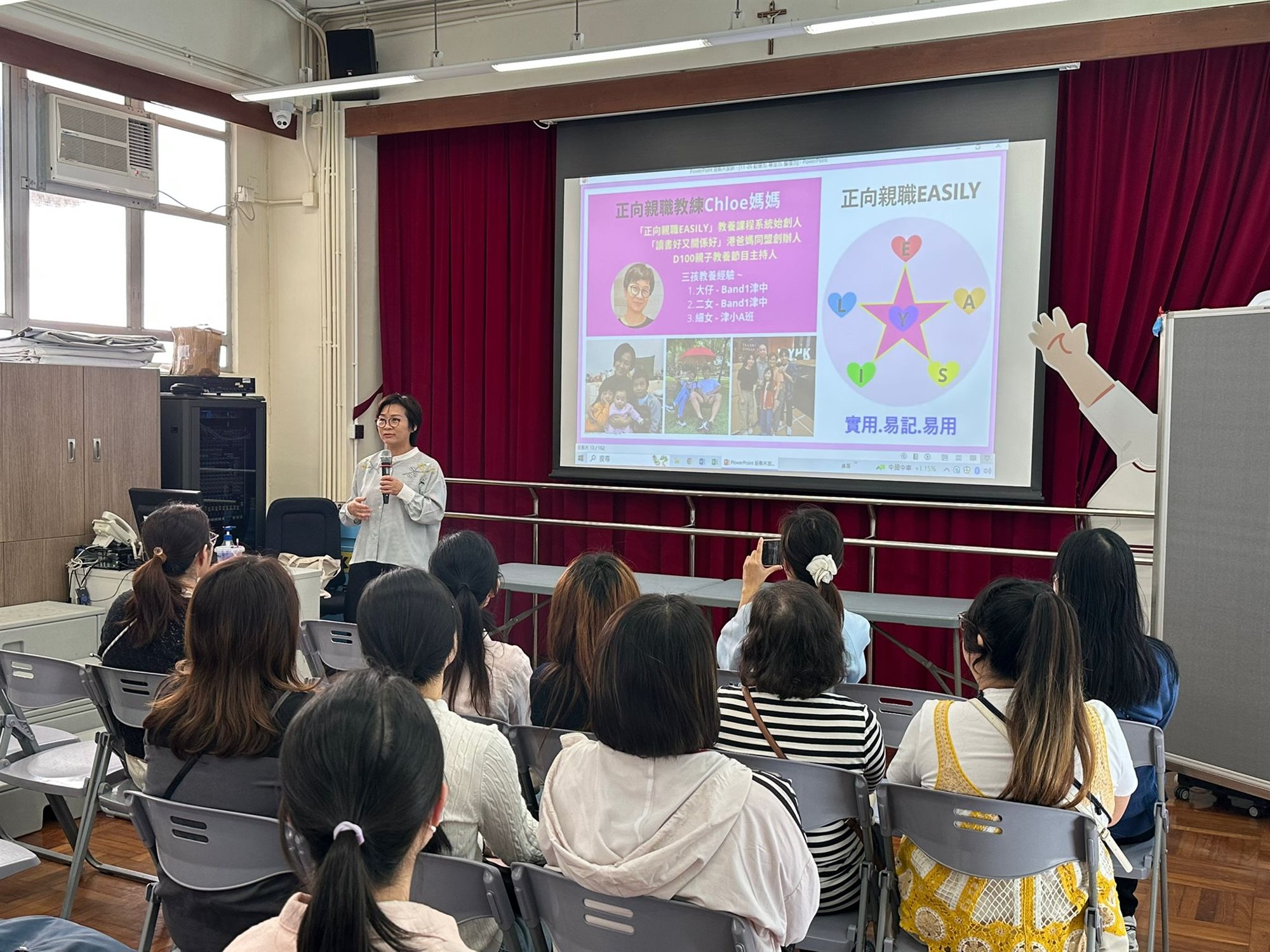 透過閱讀來認識如何提升孩子的三項關鍵力:記憶力、專注力、整理力,本校圖書館邀請正向親職教練Chloe媽媽,現役三孩Band 1實戰媽媽及「正向親職Eadily教養學習系統」創辦人到校,透過運用本校圖書館資源及講員分享,讓家長了解如何調整生活小細節,以提升孩子的記憶力、專注力及整理力。