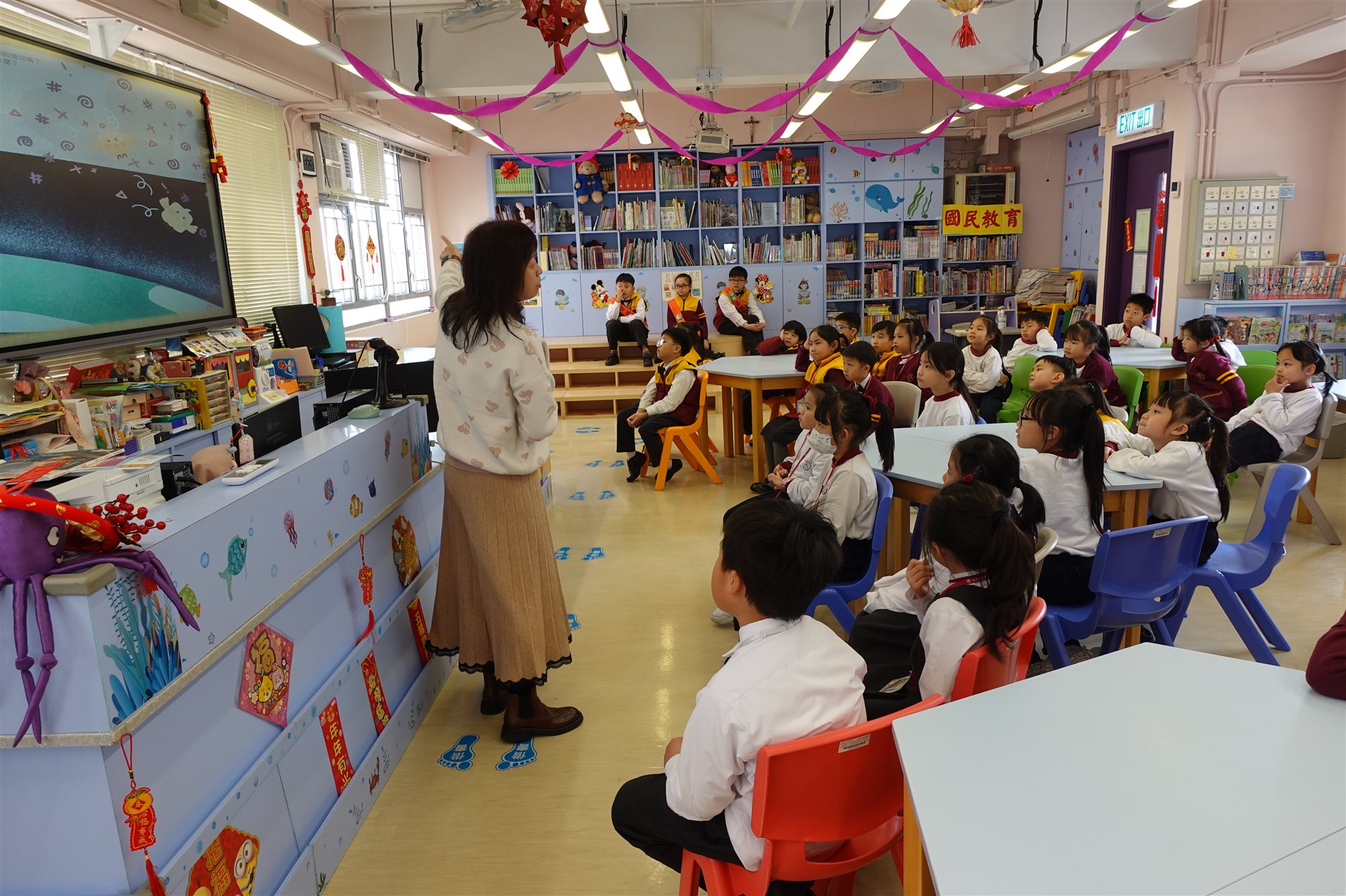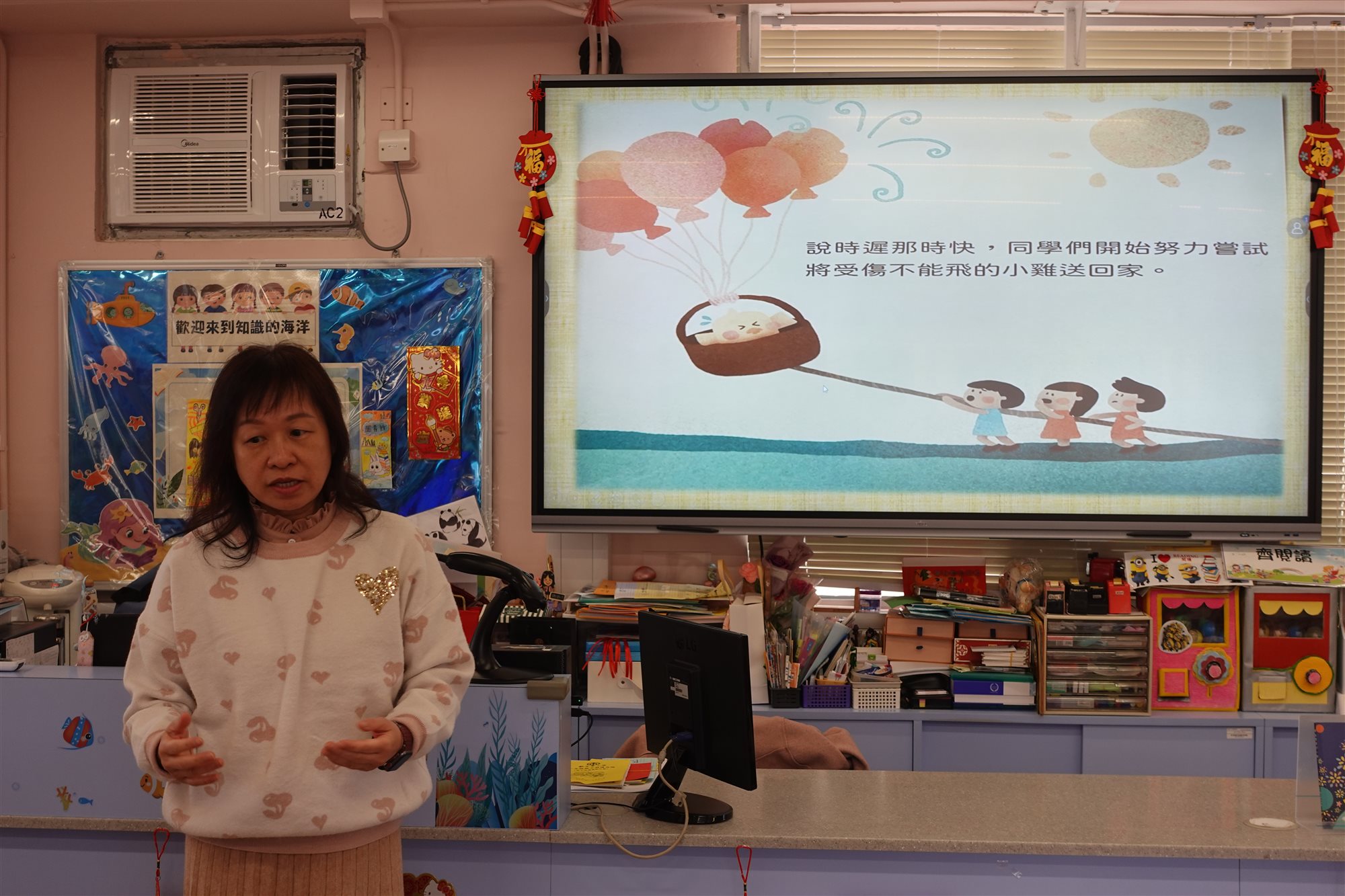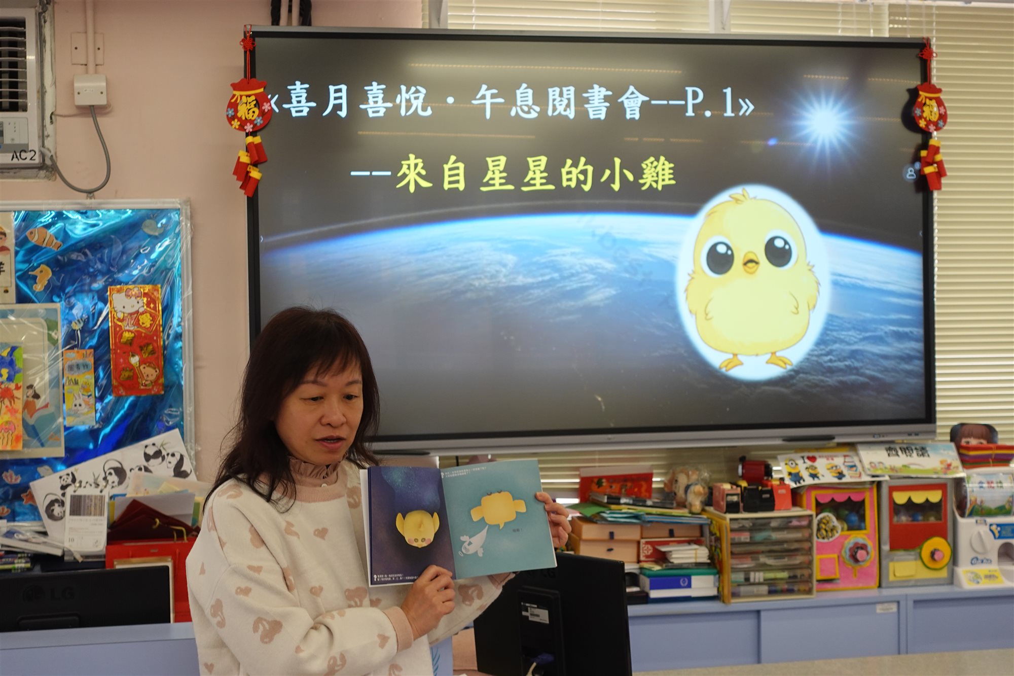 圖書館胡老師透過分享繪本--《來自星星的小雞》,記述一隻小雞意外地從外太空墜落地球.主角們送小雞回家的過程,引導一年級學生學習感恩和嘗試多角度觀察事物,再配以延伸閱讀活動,讓他們培養感恩的習慣。