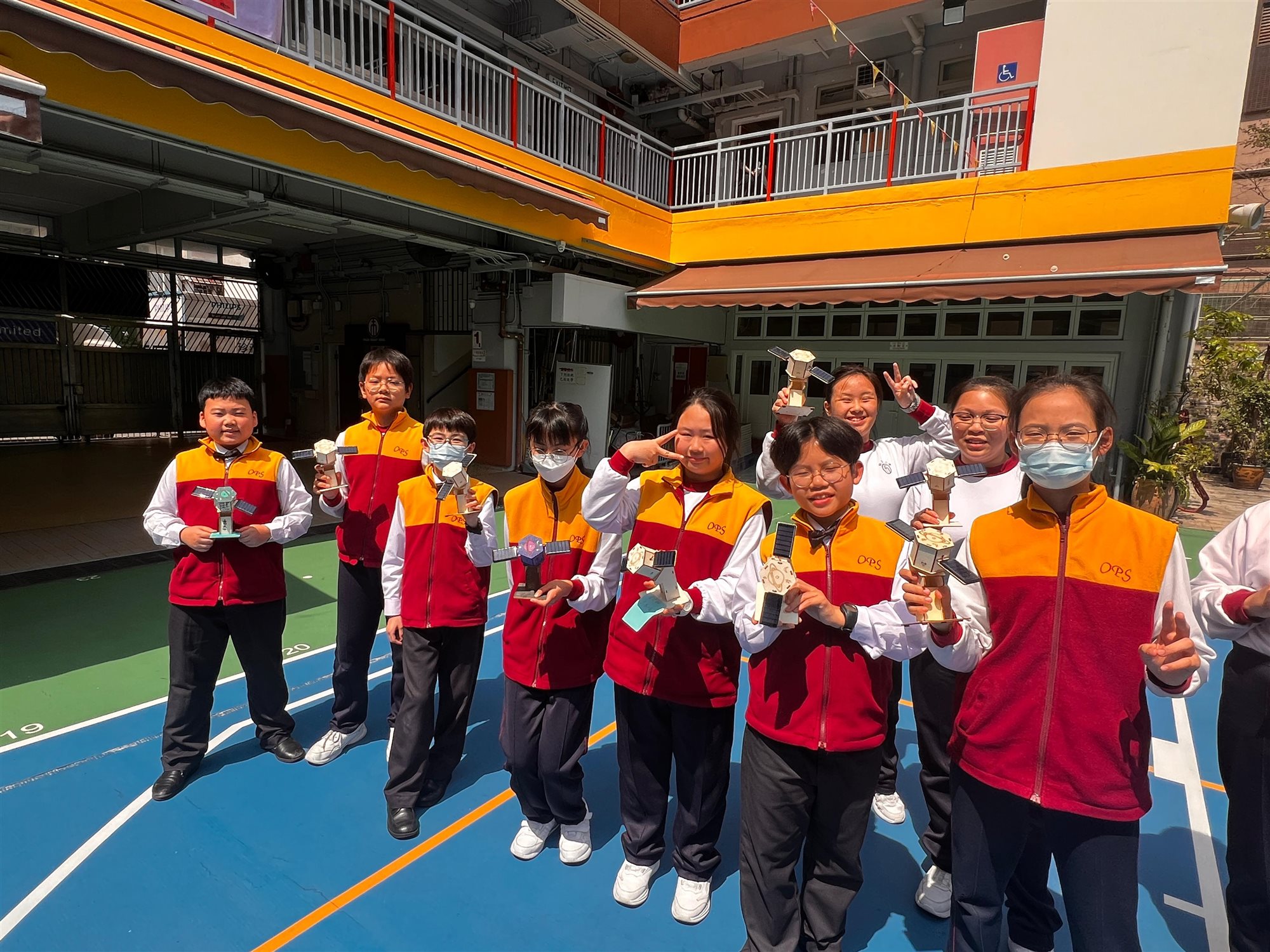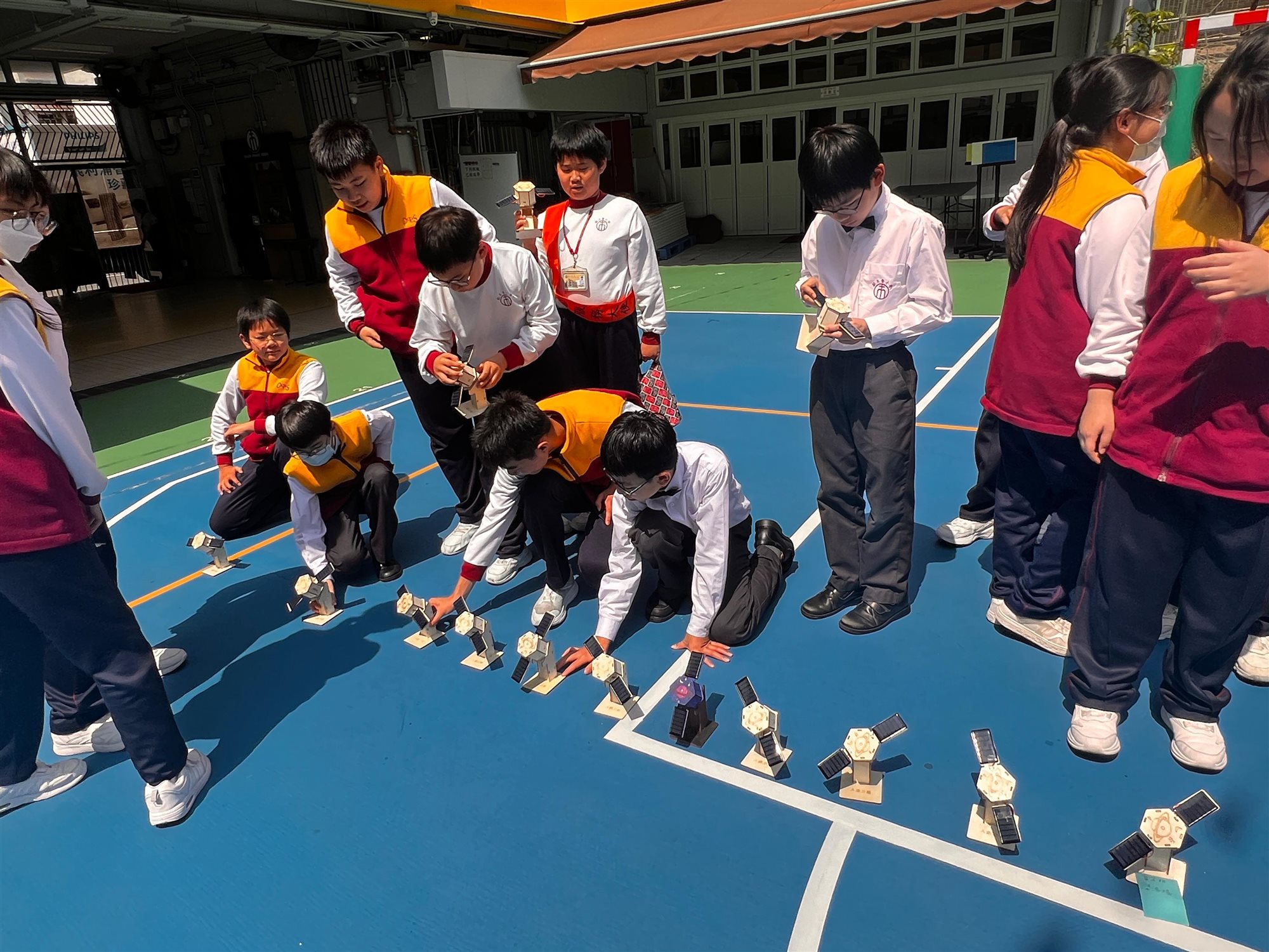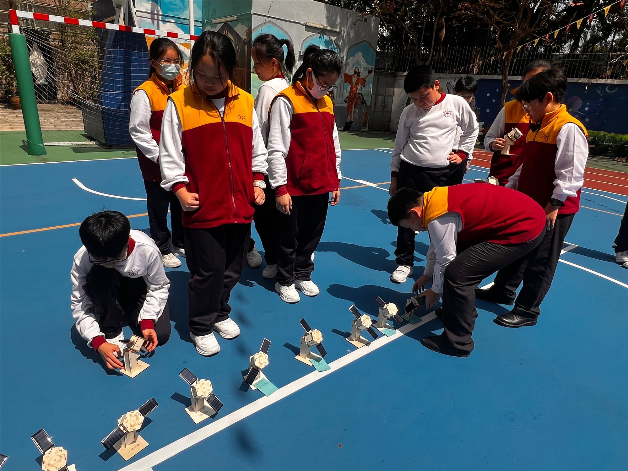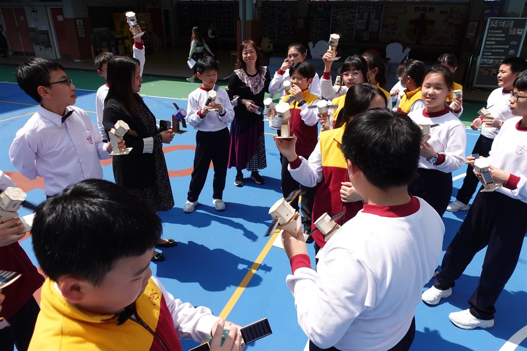 圖書館胡老師精心策劃一場別開生面的STEAM閱讀活動,向六年級學生推介《圖解中國科技超級工程——探索國家工程裡的科學奧秘》一書後,讓同學們深入認識中國近年眾多震撼「超級工程」背後的科技奧秘。 活動緊扣STEAM教育理念,學生親手DIY製作「太陽能人造衛星」模型,化身小小科學家體驗工程實踐。 完工後,吳校長及師生興奮移師操場展開實地試驗:在晴朗天氣下,學生們分成小組,將太陽能驅動的衛星模型置於陽光曝曬,觀察其尾巴如何隨太陽能轉化成運動而「噴射」出炫目光芒;老師引導記錄光照強度,學生們一邊討論「為何陰影區會減速」、「如何優化太陽能板角度」,一邊反覆調整模型,反覆測試,現場充滿歡呼與驚嘆聲,充分激發科學探究精神與團隊合作熱情。