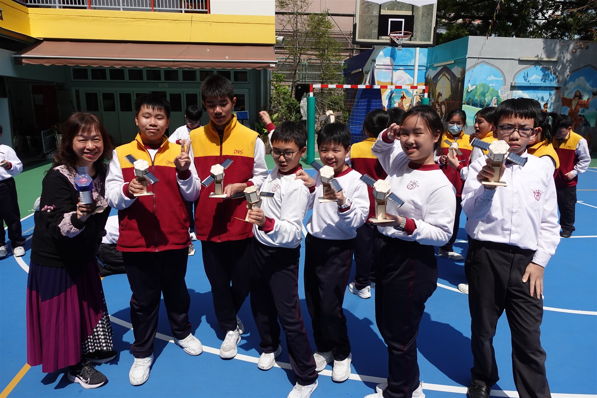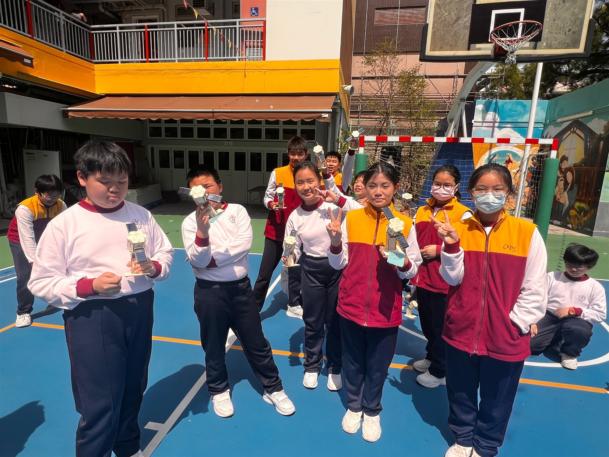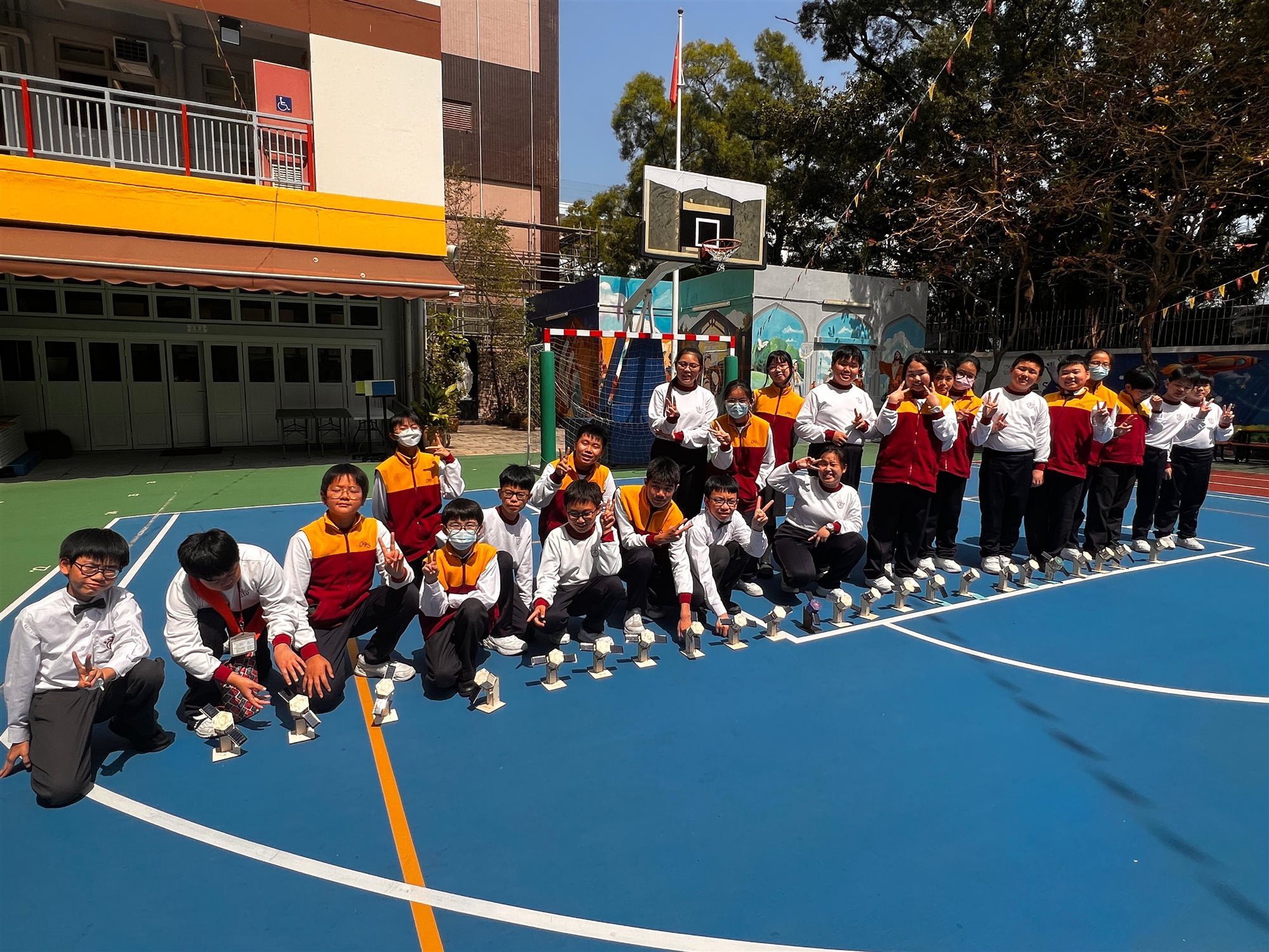 圖書館胡老師精心策劃一場別開生面的STEAM閱讀活動,向六年級學生推介《圖解中國科技超級工程——探索國家工程裡的科學奧秘》一書後,讓同學們深入認識中國近年眾多震撼「超級工程」背後的科技奧秘。 活動緊扣STEAM教育理念,學生親手DIY製作「太陽能人造衛星」模型,化身小小科學家體驗工程實踐。 完工後,吳校長及師生興奮移師操場展開實地試驗:在晴朗天氣下,學生們分成小組,將太陽能驅動的衛星模型置於陽光曝曬,觀察其尾巴如何隨太陽能轉化成運動而「噴射」出炫目光芒;老師引導記錄光照強度,學生們一邊討論「為何陰影區會減速」、「如何優化太陽能板角度」,一邊反覆調整模型,反覆測試,現場充滿歡呼與驚嘆聲,充分激發科學探究精神與團隊合作熱情。