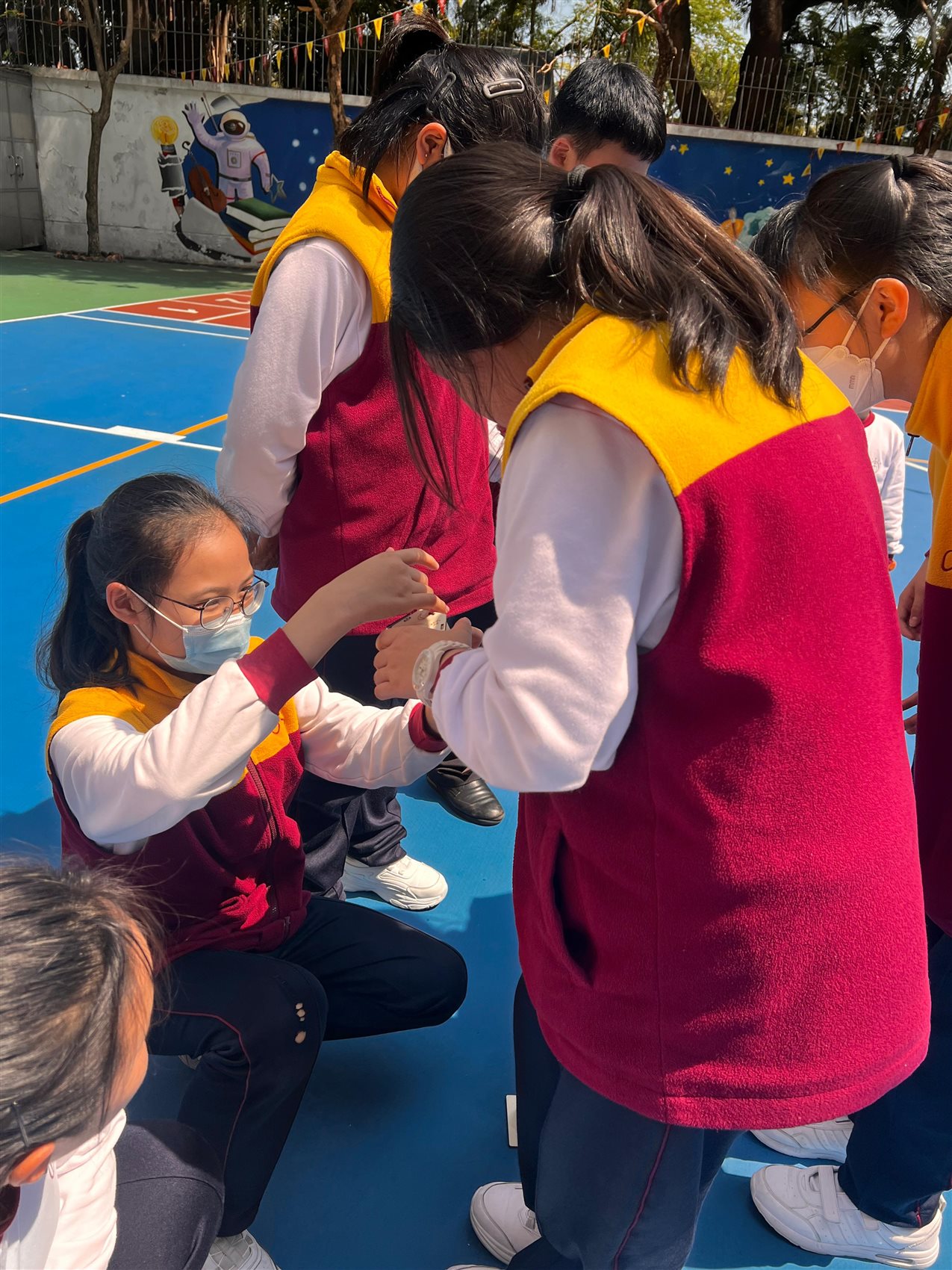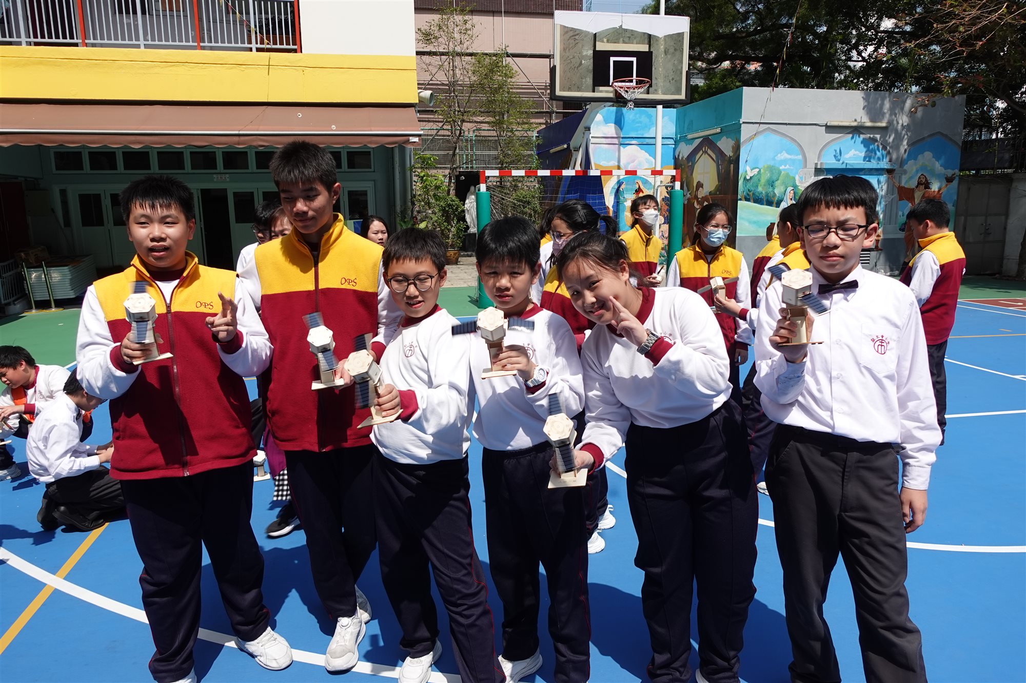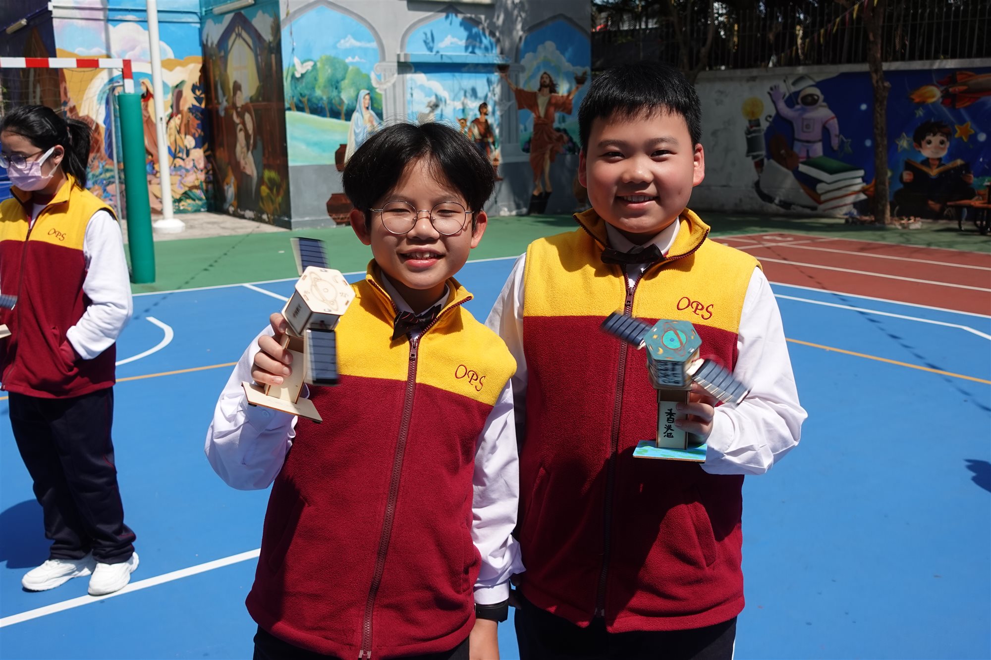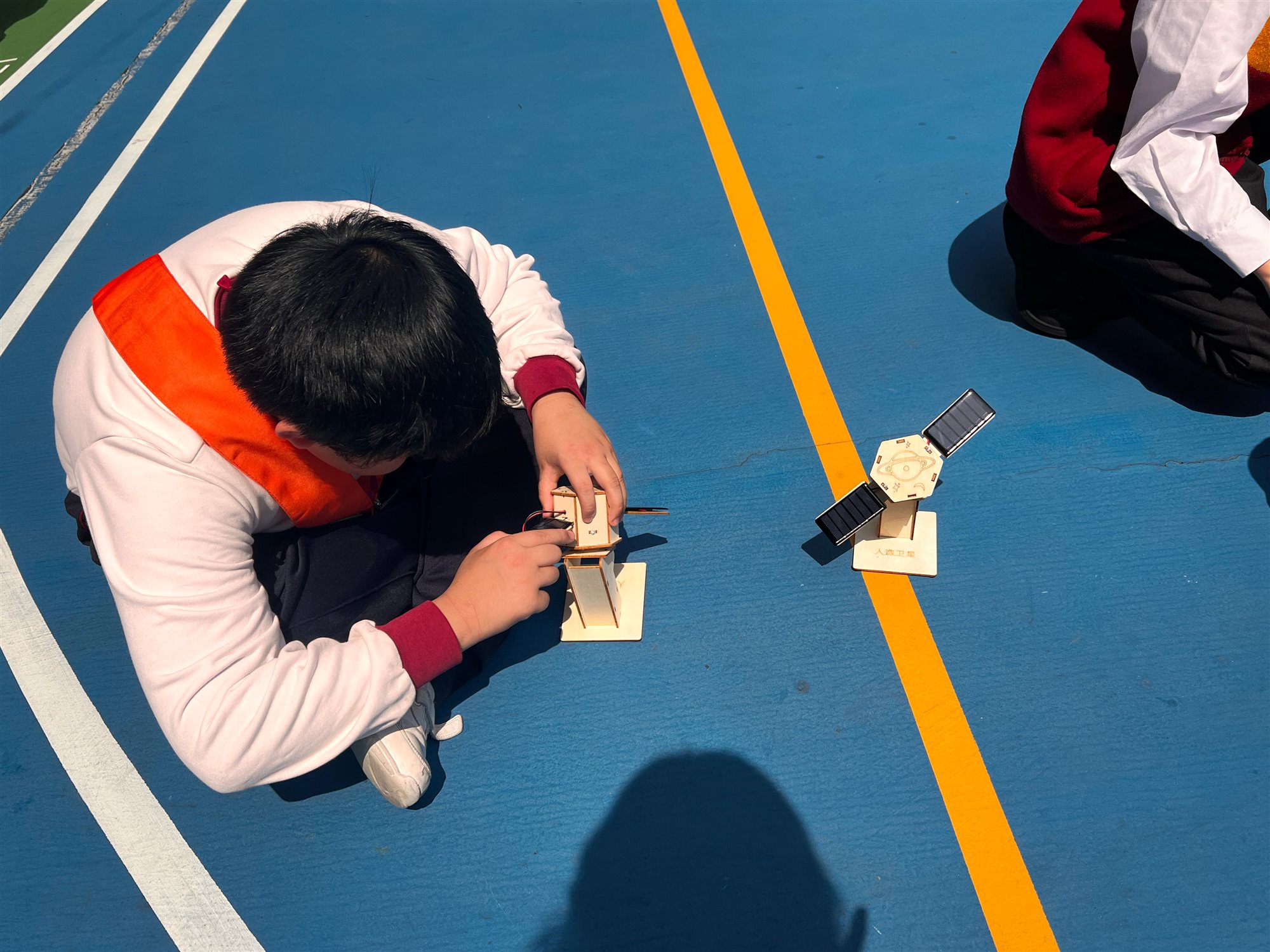 圖書館胡老師精心策劃一場別開生面的STEAM閱讀活動,向六年級學生推介《圖解中國科技超級工程——探索國家工程裡的科學奧秘》一書後,讓同學們深入認識中國近年眾多震撼「超級工程」背後的科技奧秘。 活動緊扣STEAM教育理念,學生親手DIY製作「太陽能人造衛星」模型,化身小小科學家體驗工程實踐。 完工後,吳校長及師生興奮移師操場展開實地試驗:在晴朗天氣下,學生們分成小組,將太陽能驅動的衛星模型置於陽光曝曬,觀察其尾巴如何隨太陽能轉化成運動而「噴射」出炫目光芒;老師引導記錄光照強度,學生們一邊討論「為何陰影區會減速」、「如何優化太陽能板角度」,一邊反覆調整模型,反覆測試,現場充滿歡呼與驚嘆聲,充分激發科學探究精神與團隊合作熱情。