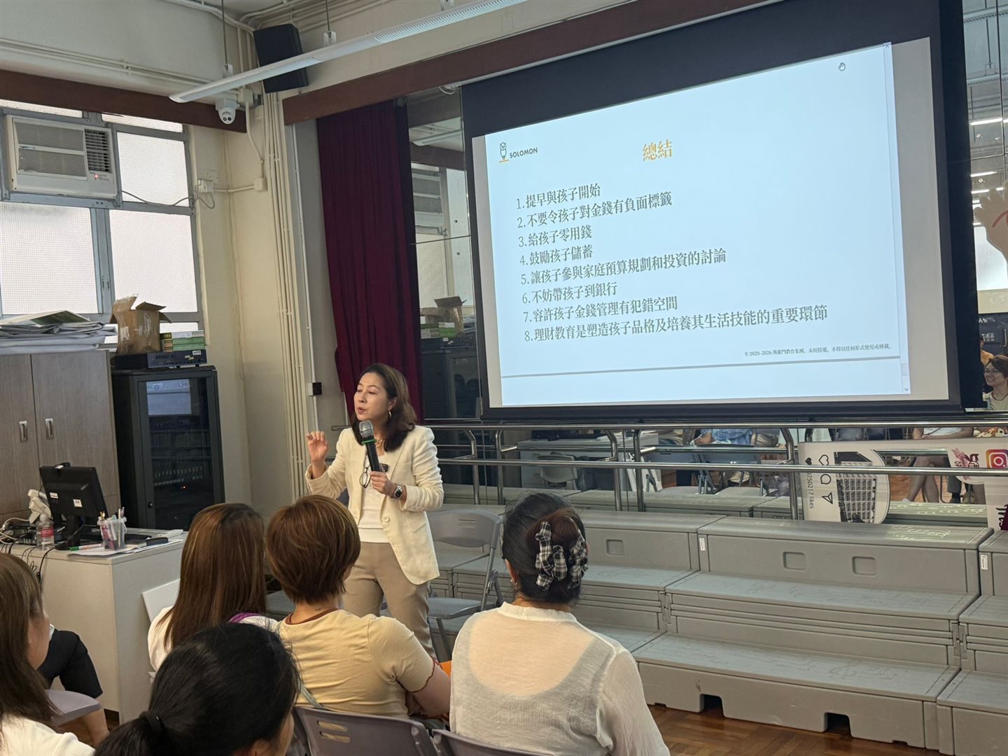 為培養學生正確的理財價值觀,賽馬會「智」理財計劃專業顧問舉辦家長理財教育講座。 講座深入探討如何引導子女分辨**「想要」與「需要」**,並分享「儲蓄、消費、分享」的三分法分配技巧,將抽象的金錢概念轉化為日常實踐。因應電子支付普及,講者亦指導家長如何協助孩子建立數字理財感,避免衝動消費。 本校將繼續推動理財教育,與家長並肩同行,引領孩子掌握守財、用財與分享的智慧,為未來人生規劃奠定堅實基石。